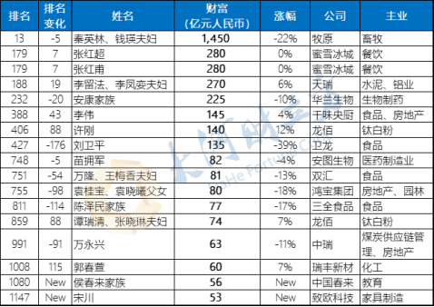 牧原受猪肉价格下跌影响,秦英林、钱瑛夫妇财富较去年下跌22%,以1450亿元居全国第13位,为河南唯一进入Top100的企业家。
