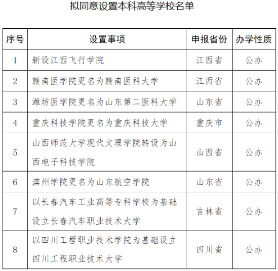 【大河财立方消息】11月6日,据教育部网站,根据相关规定,经教育部党组会议审议,教育部拟同意设置江西飞行学院等8所学校,现予公示。