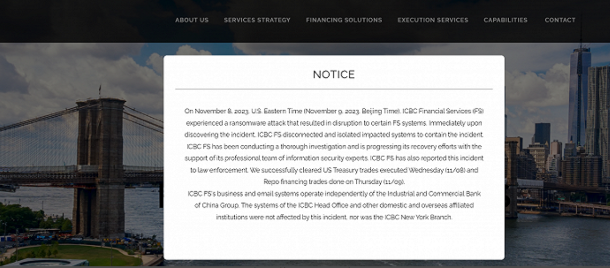 11月10日,中国工商银行股份有限公司在美全资子公司——工银金融服务有限责任公司(ICBCFS)在官网发布声明称,美东时间11月8日,ICBCFS遭勒索软件攻击,导致部分系统中断。ICBCFS表示,发现攻击后立即切断并隔离了受影响系统,已展开彻底调查并向执法部门报告,正在专业信息安全专家团队的支持下推进恢复工作。