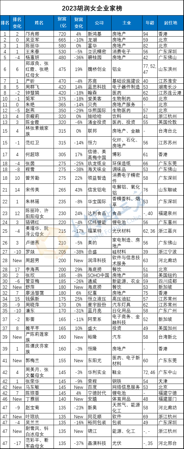 新鸿基创办人郭得胜的夫人邝肖卿,以720亿元财富首次成为中国女首富;龙湖吴亚军以665亿元,蝉联中国白手起家女首富。