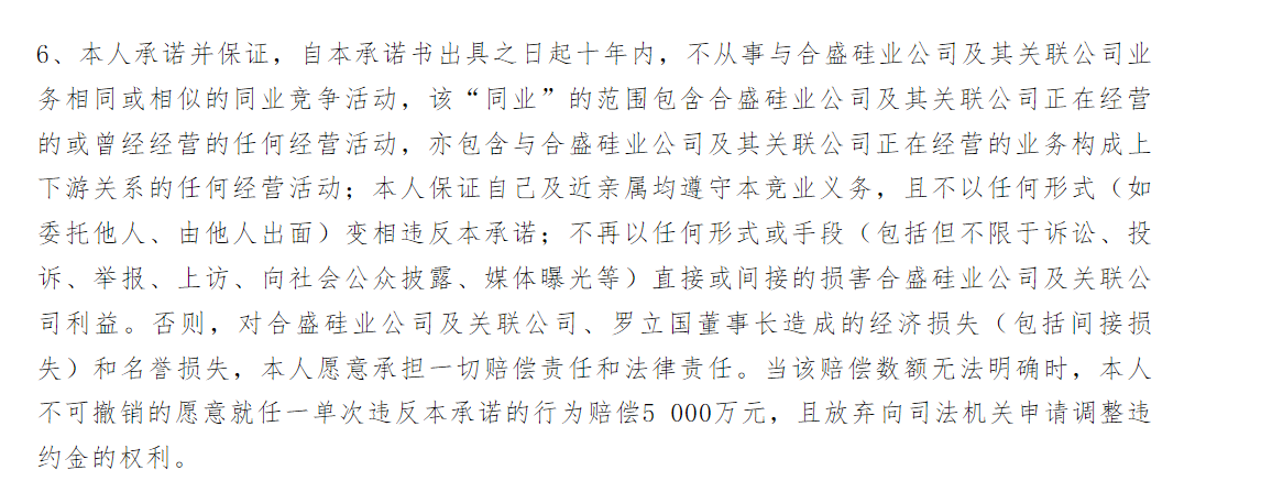 如果方红承违反上述任一条款,即如未向法院撤回起诉、撤回执行、未配合公司签署相关涤除股东身份材料等,则不可撤销的向英融公司赔偿违约金1000万元,同时不免除本人实体承诺义务的履行。同时,如果方红承及其近亲从事与合盛硅业公司及其关联公司业务相同或相似的同业竞争活动,对合盛硅业公司及关联公司、罗立国董事长造成的经济损失(包括间接损失)和名誉损失,当该赔偿数额无法明确时,方红承不可撤销的愿意就任一单次违反本承诺的行为赔偿5000万元,且放弃向司法机关申请调整违约金的权利。