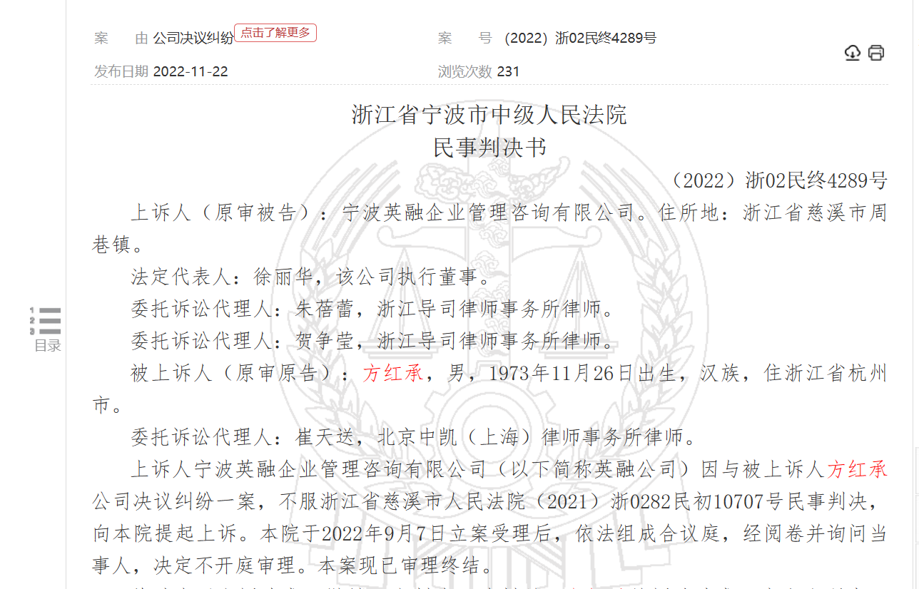 以慈溪市人名法院开庭的这起诉讼为例,中国裁判文书网显示,案号(2021)浙0282民初10707号裁定,2021年12月28开庭审理,2022年7月29日慈溪法院裁定方红承胜诉。随即合盛硅业的持股平台英融公司上诉。当年11月11日,宁波市中级人民法院认定事实与一审认定事实一致(案号(2022)浙02民终4289号),驳回英融公司上诉请求,该院认为,方红承作为英融公司的股东,其享有参加股东会并进行表决的权利。记者注意到,浙江省宁波市中级人民法院指出,英融公司2019年变更名字期间,有四次会决议签字页中“方红承”的签字均系他人代签,英融公司庭审中对上述事实予以了确认。