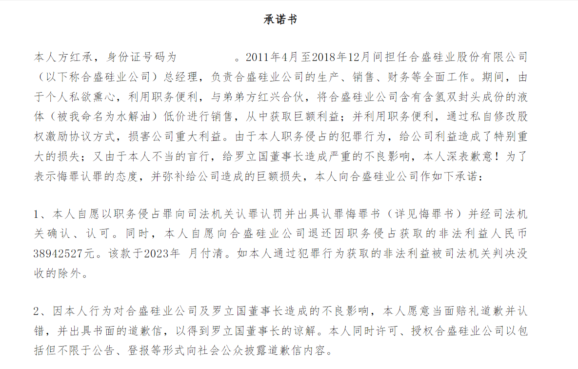 附件承诺书显示,方红承需要承诺:1、自愿以职务侵占罪向司法机关认罪认罚并出具认罪悔罪书(详见悔罪书)并经司法机关确认、认可。同时,本人自愿向合盛硅业公司退还因职务侵占获取的非法利益人民币3894.2527万元;2、方红承愿意当面赔礼道歉并认错,并出具书面的道歉信,以得到罗立国董事长的谅解。本人同时许可、授权合盛硅业公司以包括但不限于公告、登报等形式向社会公众披露道歉信内容;3、承诺书出具后十日内全额退还已经取得股权转让款1305.5万元给罗立国。