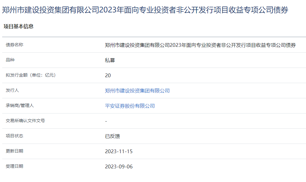 【大河财立方消息】11月15日,据上交所网站,郑州市建设投资集团有限公司2023年面向专业投资者非公开发行项目收益专项公司债券项目状态更新为“已反馈”。该债券拟发行金额为20亿元,承销商/管理人为平安证券。