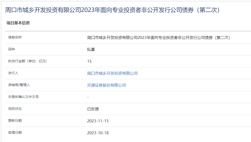【大河财立方消息】11月15日,据上交所网站,周口市城乡开发投资有限公司拟发行15亿元公司债券,已获上交所反馈。