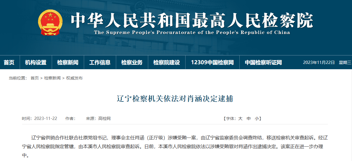 辽宁省供销合作社联合社原党组书记、理事会主任肖涵(正厅级)涉嫌受贿一案,由辽宁省监察委员会调查终结,移送检察机关审查起诉。经辽宁省人民检察院指定管辖,由本溪市人民检察院审查起诉。日前,本溪市人民检察院依法以涉嫌受贿罪对肖涵作出逮捕决定。该案正在进一步办理中。