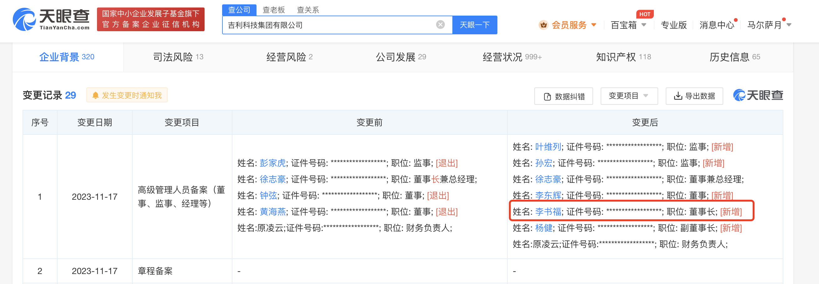 【大河财立方消息】天眼查App显示,近日,吉利科技集团有限公司发生工商变更,徐志豪由董事长兼总经理变更为董事兼总经理,黄海燕、彭家虎等卸任董事、监事,新增李书福为董事长,杨健为副董事长,李东辉、叶维列等为董事、监事。