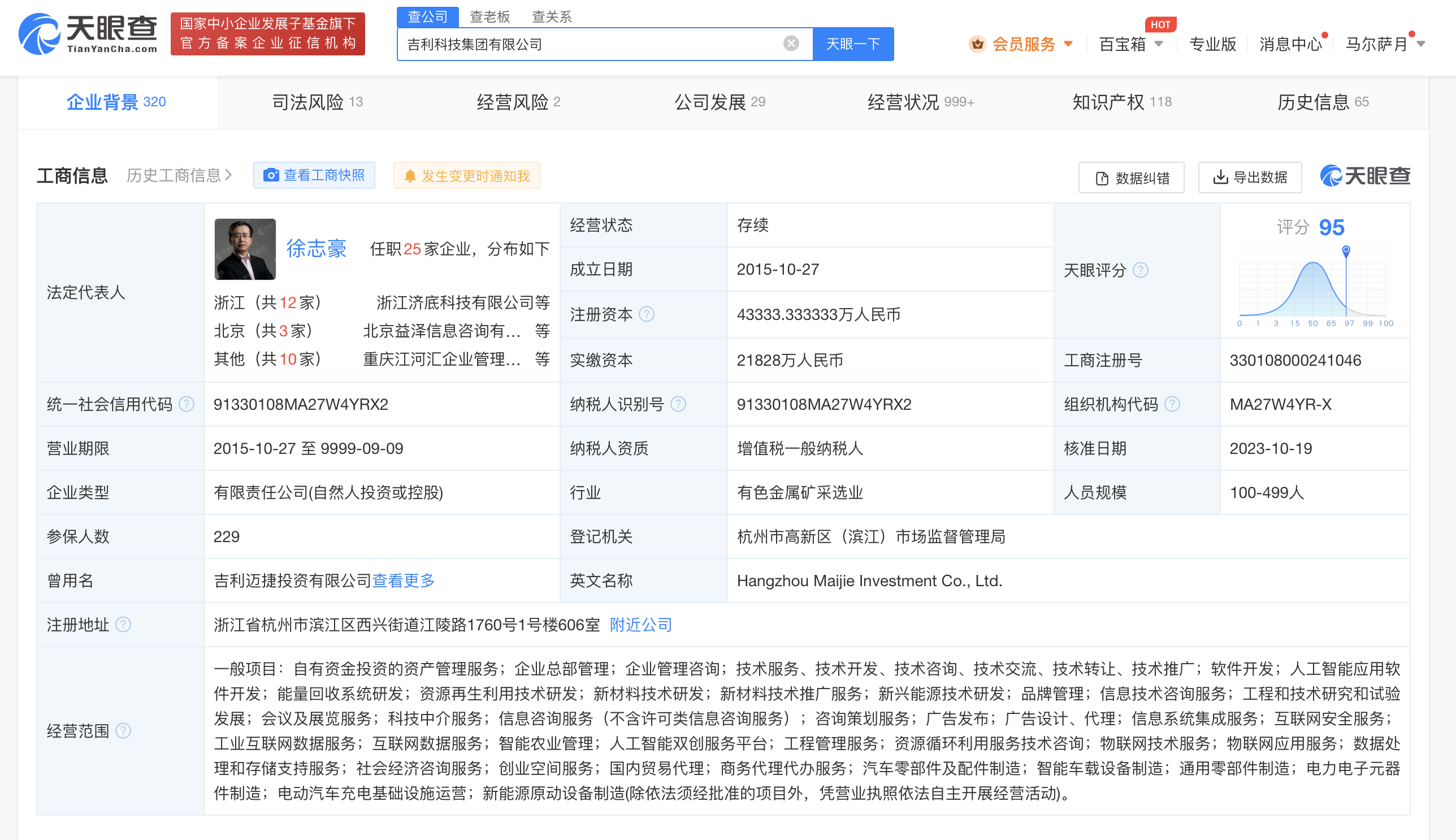 吉利科技集团有限公司成立于2015年10月,法定代表人为徐志豪,注册资本约4.33亿人民币,经营范围含自有资金投资的资产管理服务、企业总部管理、人工智能应用软件开发、新材料技术研发、汽车零部件及配件制造、智能车载设备制造等,由宁波锐马企业管理合伙企业(有限合伙)、浙江济底科技有限公司、杭州吉行科技有限公司共同持股。
