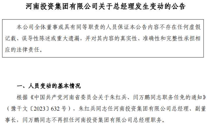 【大河财立方消息】11月27日,河南投资集团发布公告称,根据河南省委任免通知,朱红兵任河南投资集团总经理、副董事长,闫万鹏不再担任河南投资集团总经理职务。本次调整后,闫万鹏继续担任河南投资集团党委书记、董事长。
