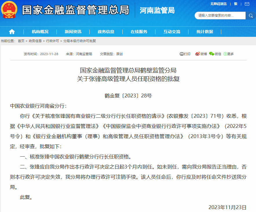 国家金融监督管理总局鹤壁监管分局核准张锋了中国农业银行鹤壁分行行长的任职资格