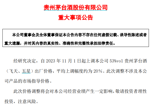 10月31日晚,贵州茅台发布公告称,经研究决定,自2023年11月1日起上调53%vol贵州茅台酒(飞天、五星)出厂价格,平均上调幅度约为20%。此次调整不涉及产品的市场指导价格。