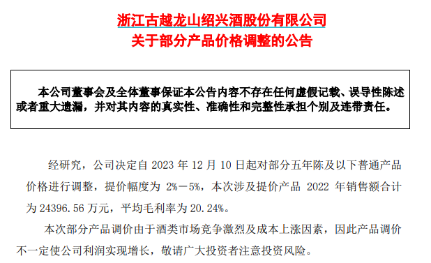【大河财立方消息】11月28日,古越龙山(600059)发布公告称,经研究,公司决定自2023年12月10日起对部分五年陈及以下普通产品价格进行调整,提价幅度为2%-5%,本次涉及提价产品 2022 年销售额合计为24396.56万元,平均毛利率为20.24%。本次部分产品调价由于酒类市场竞争激烈及成本上涨因素,因此产品调价不一定使公司利润实现增长。