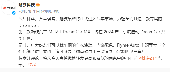 【大河财立方消息】11月30日,魅族科技发布微博称,魅族品牌将正式进入汽车市场,第一款魅族汽车MEIZU DreamCar MX,将在2024年一季度启动DreamCar共创计划。