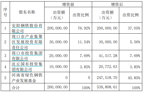 公告显示,本次增资完成后,安钢周口公司注册资本将由26亿元增加到53.98亿元。其中,河南省绿色钢铁产业发展基金认缴出资24.77亿元,持股比例为45.85%;周口市投资集团认缴出资4.15亿元,持股比例为7.69%;沈丘国有投资集团认缴出资2.08亿元,持股比例为3.85%。