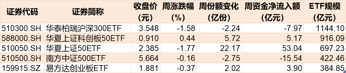 本周市场主要股指涨跌互现,5只主要指数ETF中,上证50ETF、沪深300ETF跌超1%,科创50ETF上证0.44%。