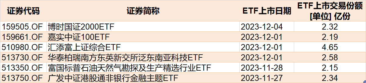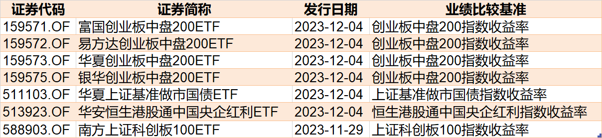 发行方面,目前有6只ETF披露下周发行,跟踪标的为创业板中盘200指数、国债、央企红利。