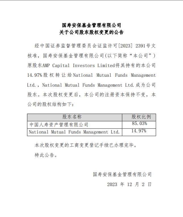 【大河财立方消息】12月2日,国寿安保基金发布公司股东股权变更公告。