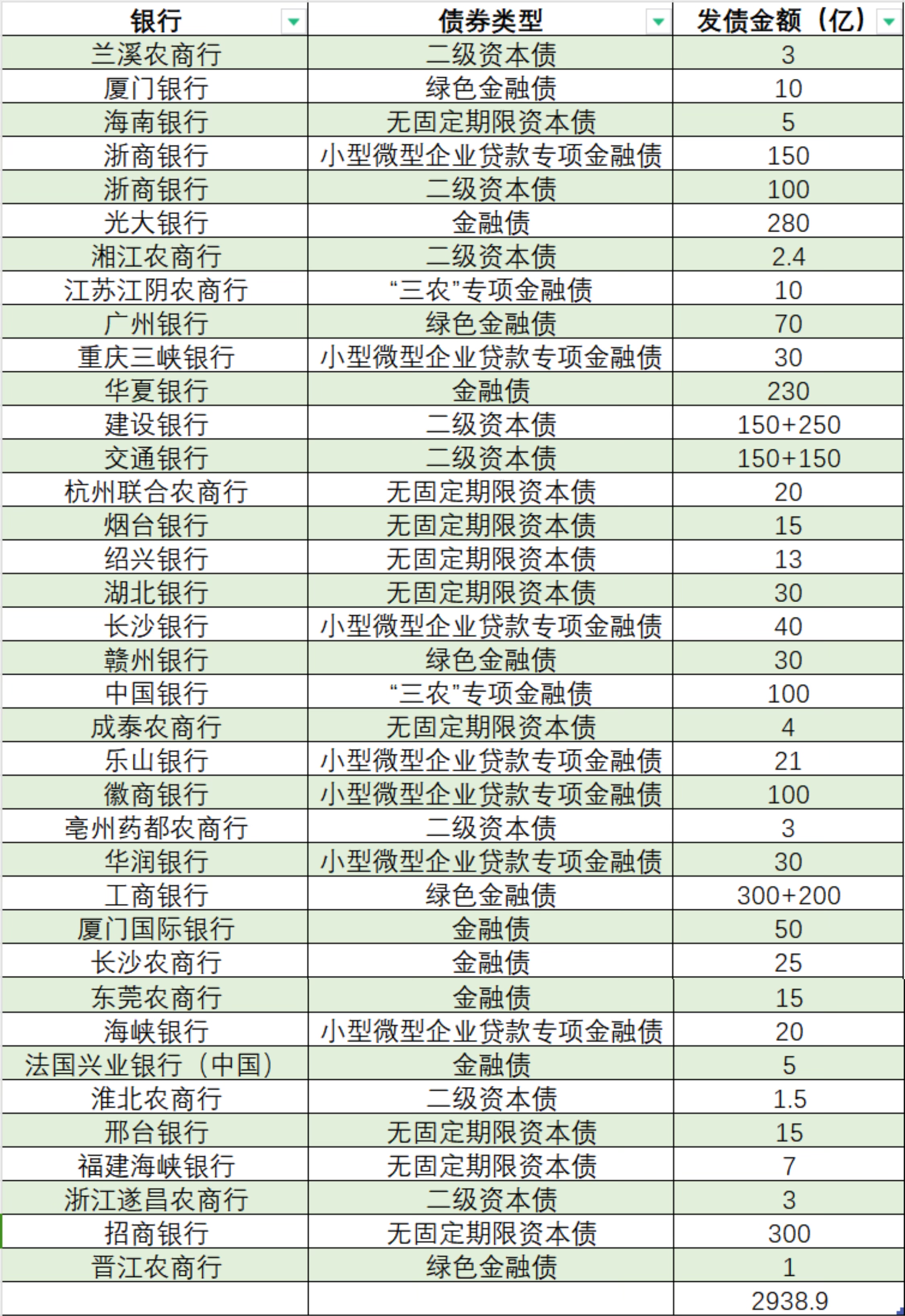 发行小型微型企业贷款专项金融债的商业银行7家共391亿元,其中:浙商银行150亿元,徽商银行100亿元,长沙银行40亿元,重庆三峡银行30亿元,华润银行30亿元,乐山银行21亿元,海峡银行20亿元。