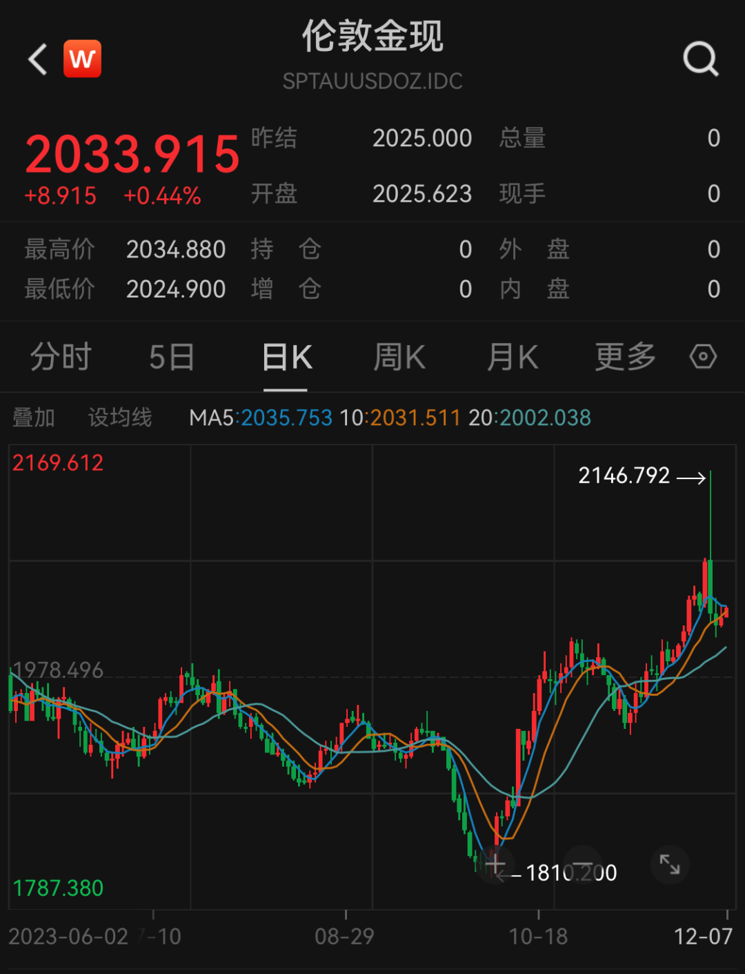 近期金价表现颇为震荡,先是出现强势上涨,如12月4日早盘,COMEX黄金一度狂飙至2152美元/盎司,伦敦金也一度攀至2146美元/盎司,双双创下历史新高。但此后又均震荡回落,截至发稿前,伦敦金报2033.915美元/盎司,涨幅为0.44%。