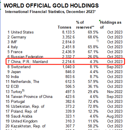 根据世界黄金协会12月公布的最新数据,截至10月末,我国央行黄金储备2214.6吨,相较于上期增加了22.56吨,在官方储备的占比仅为4.3%,且与黄金储备较多的部分国家相比,仍处于较低水平。美国、德国、意大利、法国目前黄金储备占比均超65%,俄罗斯黄金储备占比也达到26%。