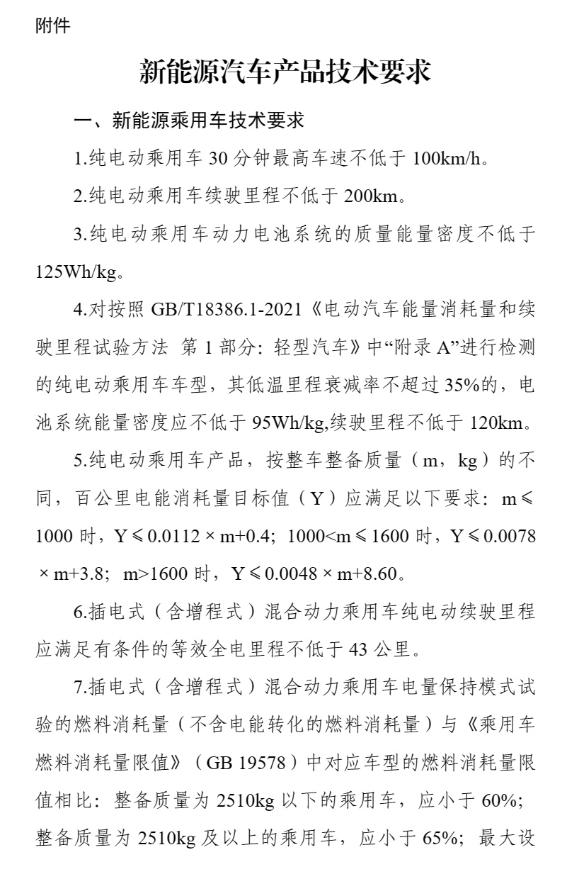 二是新增低温里程衰减技术指标要求。为引导行业企业持续提升新能源汽车产品耐低温性能,《技术要求公告》提出,对按照GB/T 18386.1《电动汽车能量消耗量和续驶里程试验方法 第1部分:轻型汽车》中“附录A”进行检测的纯电动乘用车和N1类纯电动货车,低温里程衰减率不超过35%的,电池系统能量密度可放宽至95Wh/kg,纯电动乘用车续驶里程要求可放宽至120km。