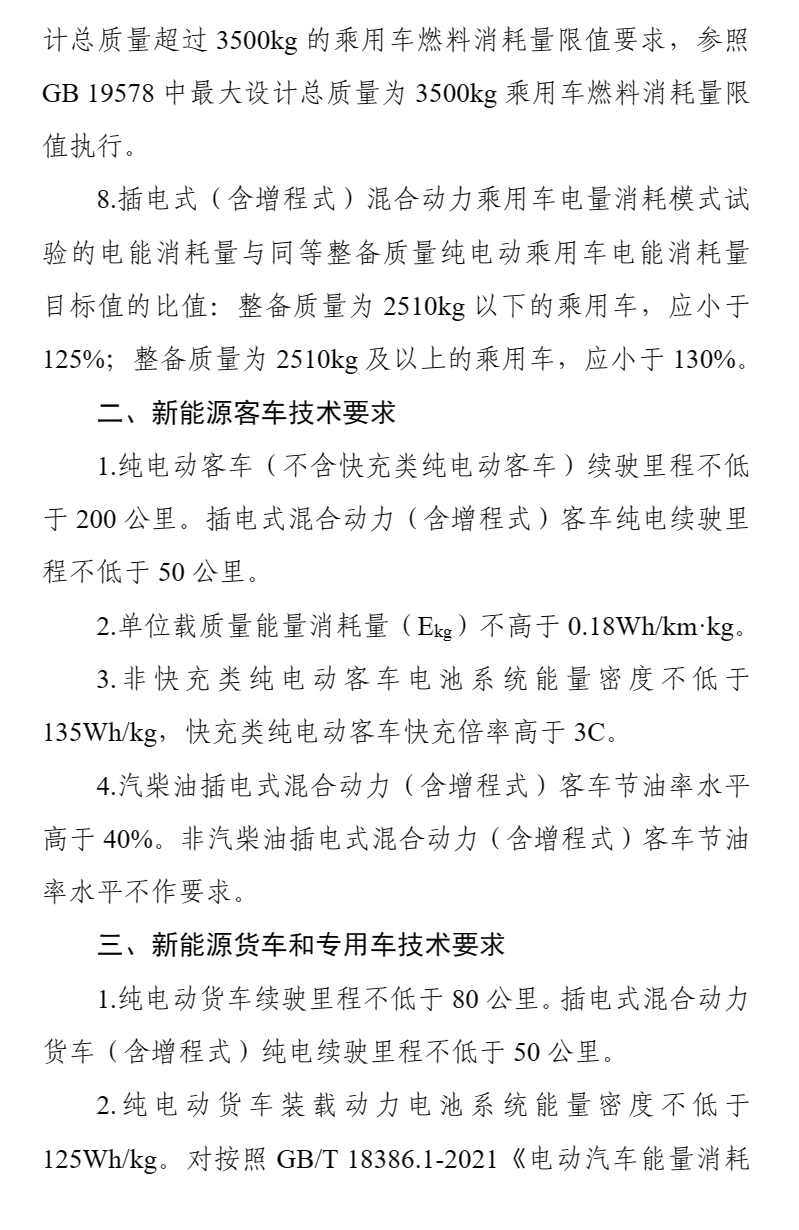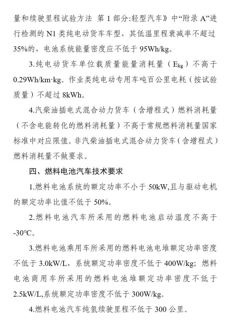 答:一是适当提高了现有技术指标要求。综合考虑技术进步和未来发展等情况,《技术要求公告》提高了整车能耗、续驶里程、动力电池系统能量密度等现有技术指标要求。燃料电池汽车方面,结合燃料电池汽车示范工作进展,优化了燃料电池汽车纯氢续驶里程、系统额定功率、系统额定功率与驱动电机额定功率之比等指标要求,补充了燃料电池启动温度、燃料电池电堆额定功率密度、系统额定功率密度等指标要求。