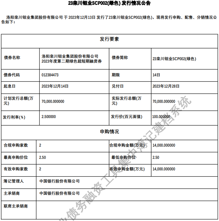 【大河财立方消息】12月14日,洛阳栾川钼业集团股份有限公司披露了2023年度第二期绿色超短期融资券发行情况。