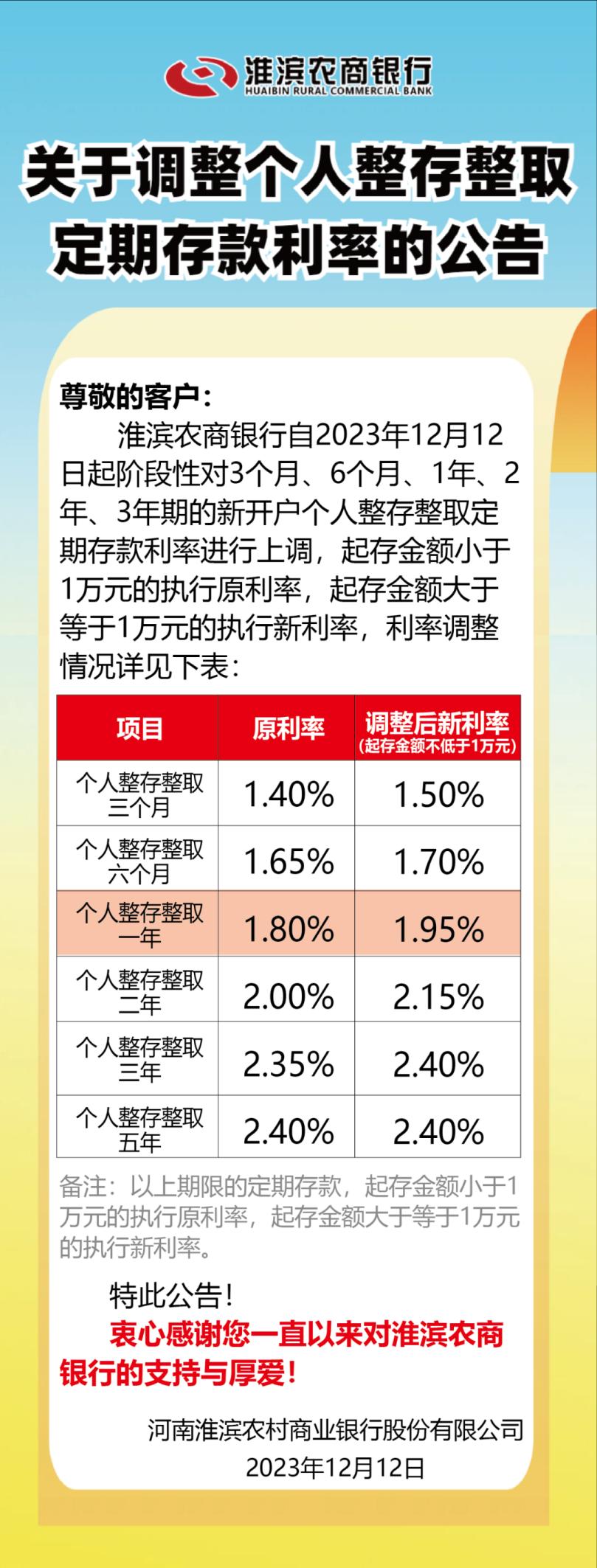 12月12日,河南淮滨农商银行宣布即日起阶段性上调新开户个人整存整取定期存款利率,起存金额大于等于1万元的执行上调后利率。具体来看,个人整存整取1年、2年、3年定期存款利率由1.80%、2.00%、2.35%上调至1.95%、2.15%、2.40%。其中,个人整存整取1年期、2年期均上调了15个BP。