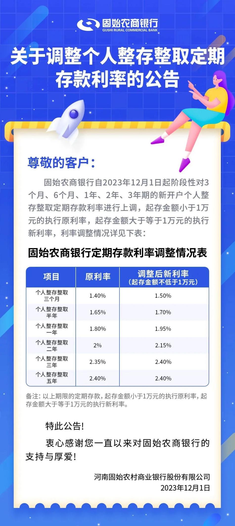 河南固始农商银行公告称,自12月1日起阶段性对3个月、6个月、1年、2年、3年期的新开户个人整存整取定期存款利率进行上调,起存金额小于1万元的执行原利率,起存金额大于等于1万元的执行新利率。其中,个人整存整取3个月上调10个BP、6个月上调5个BP,个人整存整取1年期和2年期均上调15个BP、3年期上调5个BP。