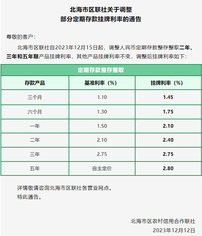 12月12日,北海农信社公告称将自12月15日起,调整人民币定期存款整存整取2年、3年、5年期产品挂牌利率,其他产品挂牌利率不变。具体来看,2年、3年、5年期产品挂牌利率为2.4%、2.75%、2.8%,较此前分别调降15BP、50BP、55BP。