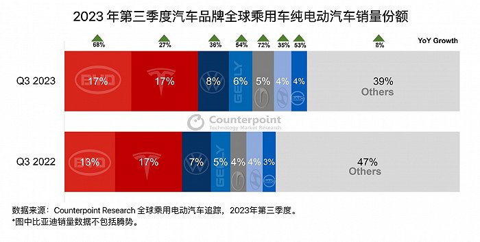 值得注意的是,比亚迪纯电动汽车市场份额(不包括腾势)已追上特斯拉,两者三季度市场份额均为17%。从数据来看,2023年第三季度,特斯拉共交付超43.5万辆,比亚迪纯电汽车共交付43.16万辆,仅仅比特斯拉低了3500辆左右,几乎持平。