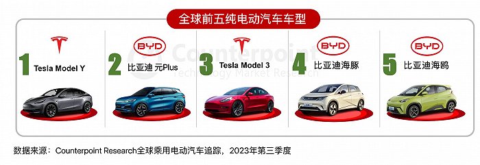 从车型来看,全球最受欢迎的车型分别为特斯拉Model Y、Model 3,和比亚迪的元Plus、海豚和海鸥。