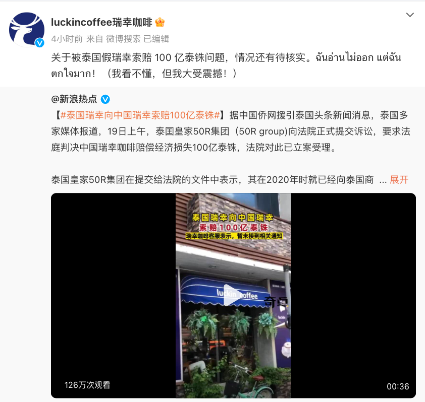 12月20日下午,@luckincoffee瑞幸咖啡回应被索赔100亿泰铢:关于被泰国假瑞幸索赔100亿泰铢(约合人民币20.3亿元)问题,情况还有待核实。