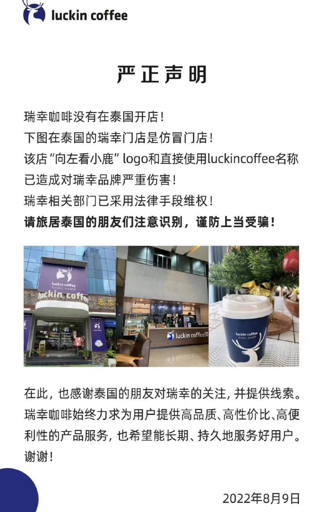 2022年8月,瑞幸咖啡曾发布声明称:泰假!瑞幸咖啡没有在泰国开店。在泰国的瑞幸门店是仿冒门店。并表示“向左看小鹿”logo和直接使用luckincoffee名称已造成对瑞幸品牌严重伤害,瑞幸相关部门已采用法律手段维权,请旅居泰国的朋友们注意识别,谨防上当受骗。
