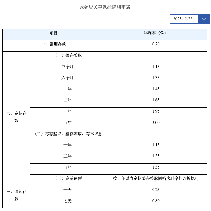 【大河财立方消息】12月22日,建设银行宣布调整人民币存款挂牌利率,其中定期整存整取三个月、半年和一年期利率均下调10个基点,一年期利率降至1.45%;二年期下调20个基点至1.65%;三年期和五年期均下调25个基点,分别至1.95%和2.00%。