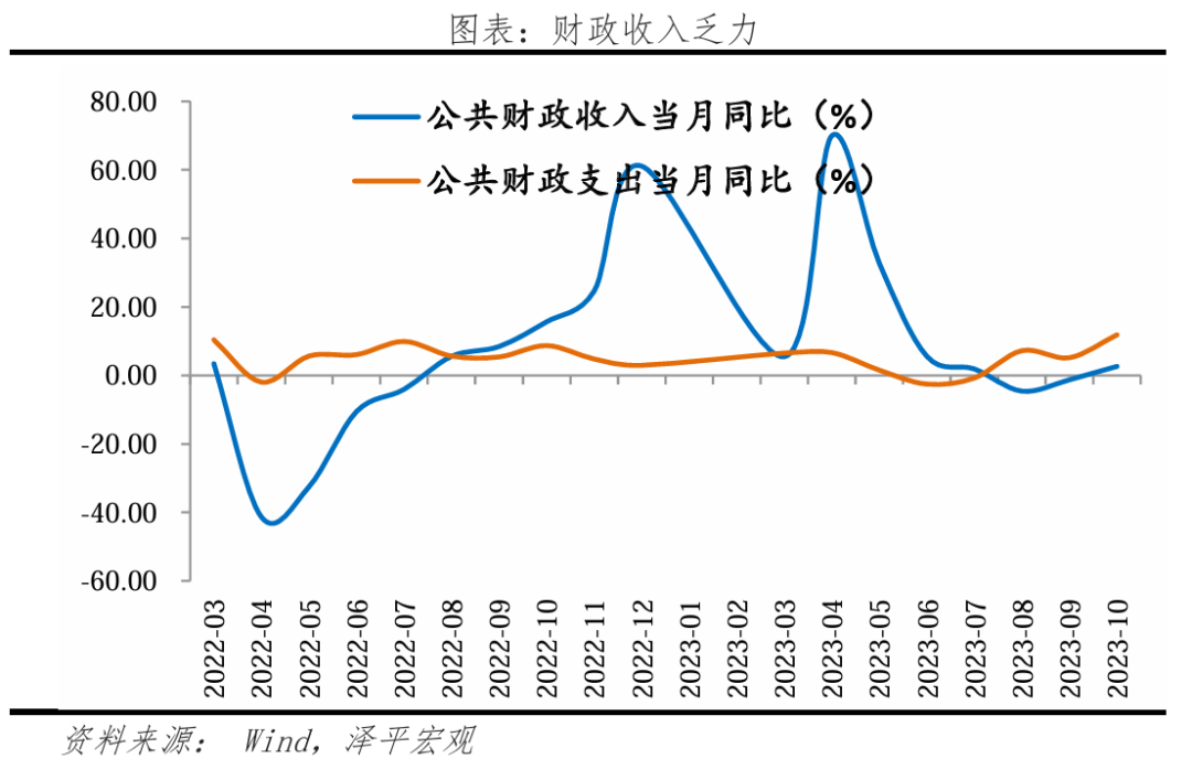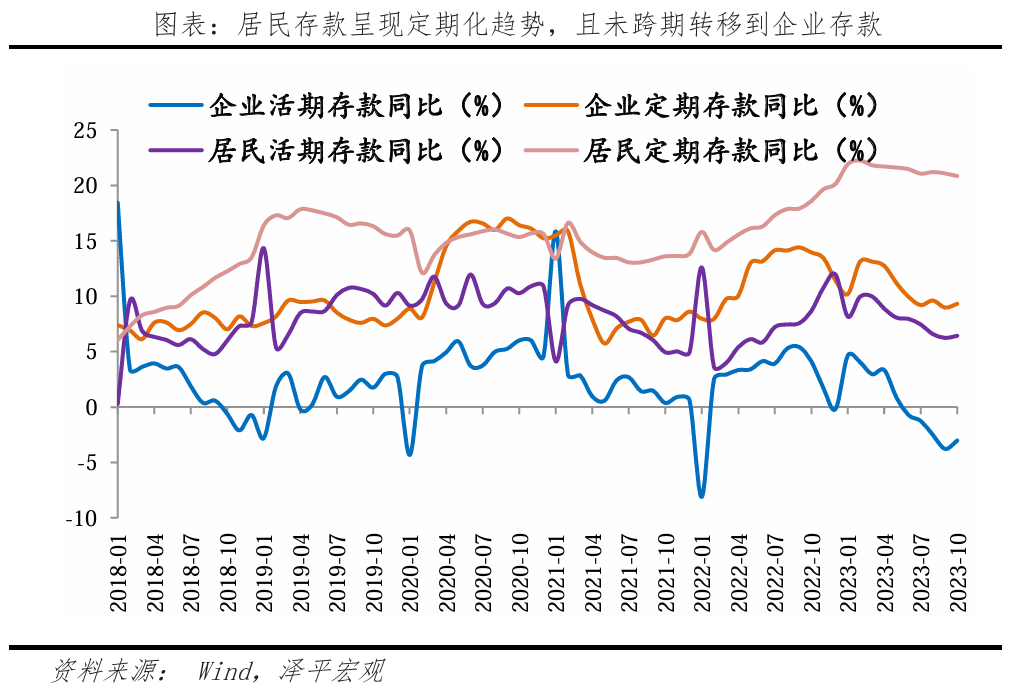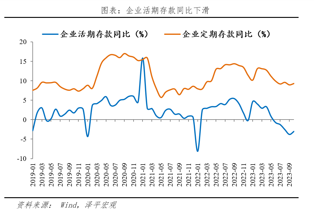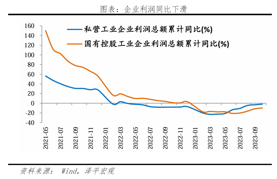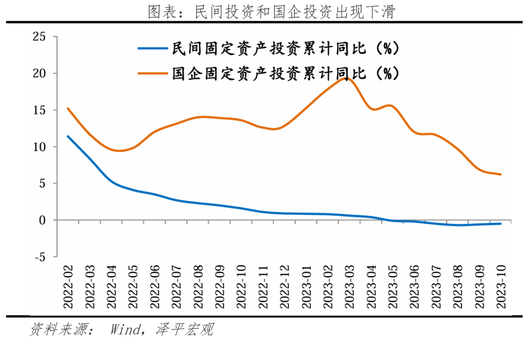 三是居民不敢消费意味着居民和企业货币交换受阻,M1低迷。自2022年以来,尽管企业信贷投放积极,但派生出的M2没有沉淀在活期账户上,体现出企业对短期内的投资扩张意愿较弱。截至2023年10月,民间投资累计增速同比仅有-0.5%,而国企同比已经降至6.2%。由于企业盈利预期不强,在获取信贷后对扩张式经营保持观望,进而将资金沉淀在定期存款。