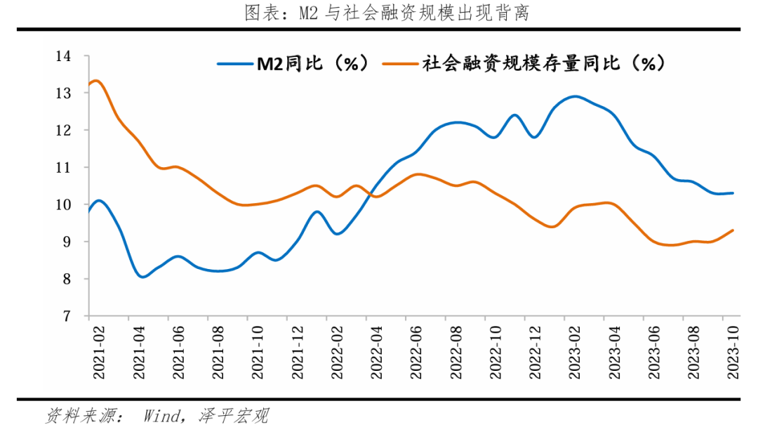 四是从供需看,货币供给多但需求少,M2增速和社会融资规模出现背离,2023年1月到10月,这一差值均值达2.14%。