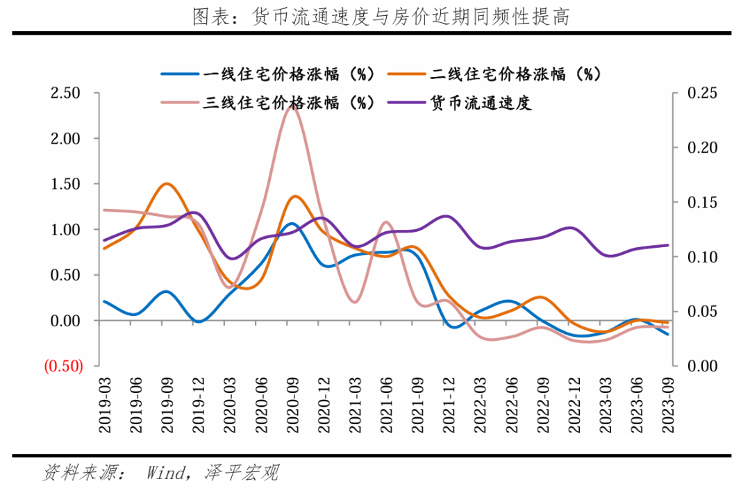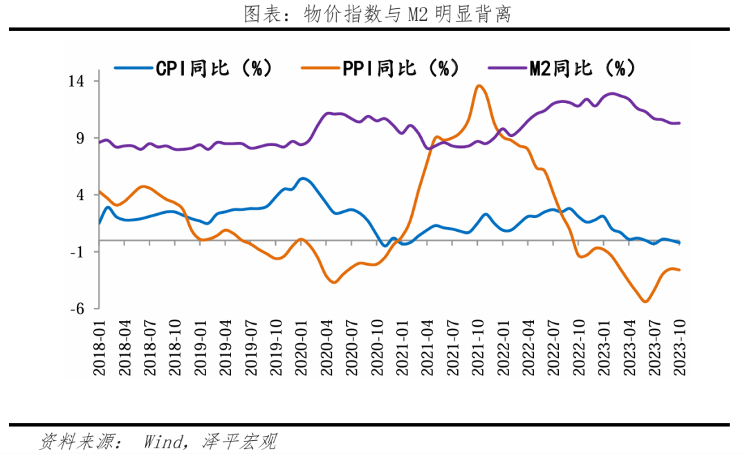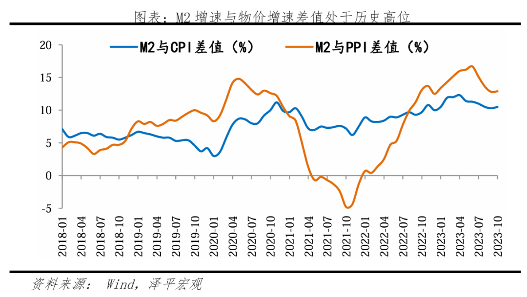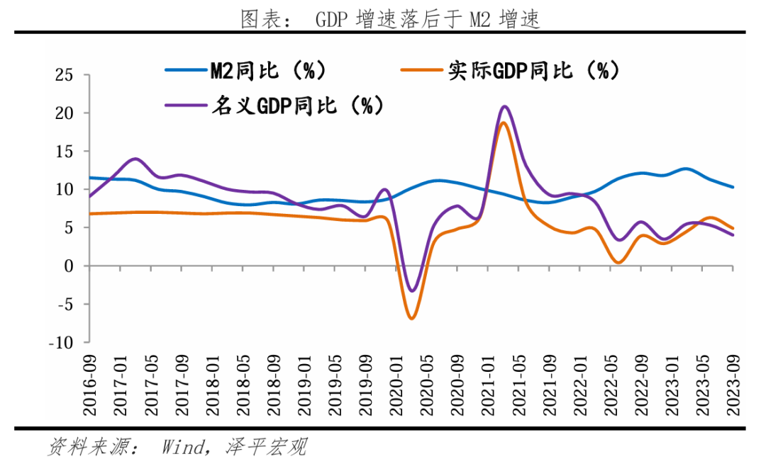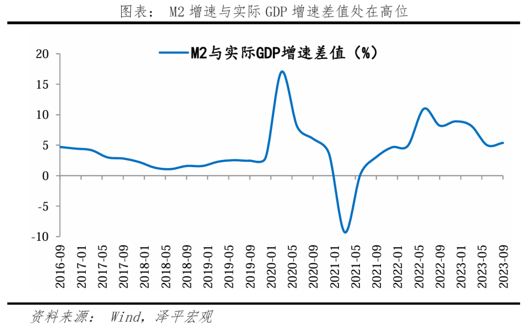 自2022年以来,尽管M2保持高增,但GDP增速一直落后于M2增速,货币投放对经济复苏的促进作用有限。2023年三季度延续这一趋势,M2累计同比10.28%,但名义GDP仅同比上涨4.38%,实际GDP同比上涨5.25%:M2增速快于名义GDP增速近6个百分点、快于实际GDP增速5个百分点。在货币宽松的环境下,总产出有所提高但与货币增速的匹配度较低。