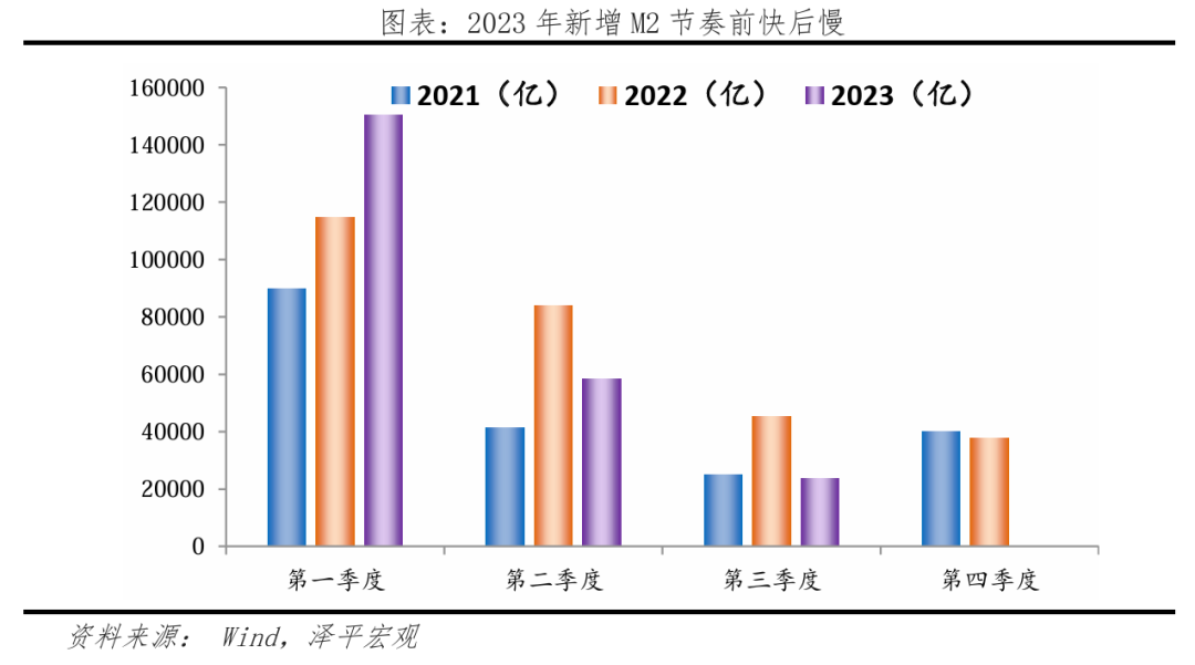 三是从货币投放节奏看,2023年呈现前快后慢。2023年我国广义货币M2总体保持高位,但增速先快后慢。一季度在2022年高基数的情况下继续保持高投放,明显高于季节性,二、三季度逐渐放缓。一季度高投放透支信贷需求叠加二三季度以来融资需求不佳,整体节奏出现放缓。