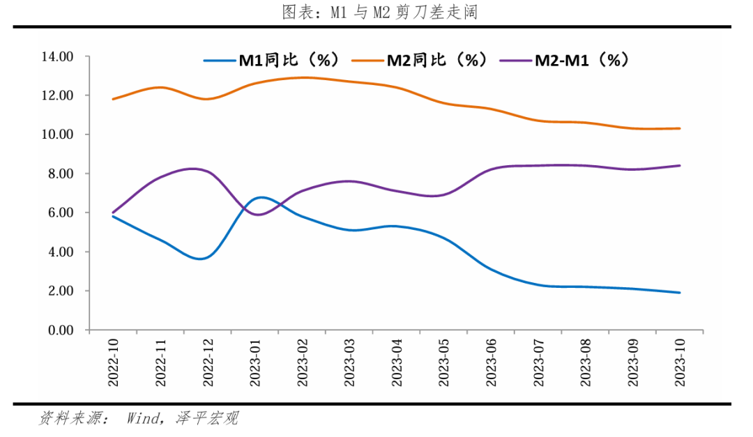 五是M1和M2剪刀差走阔,指向资金活化程度降低,2023年M2与M1同比增速差值从1月的5.9%扩大到10月的8.4%。
