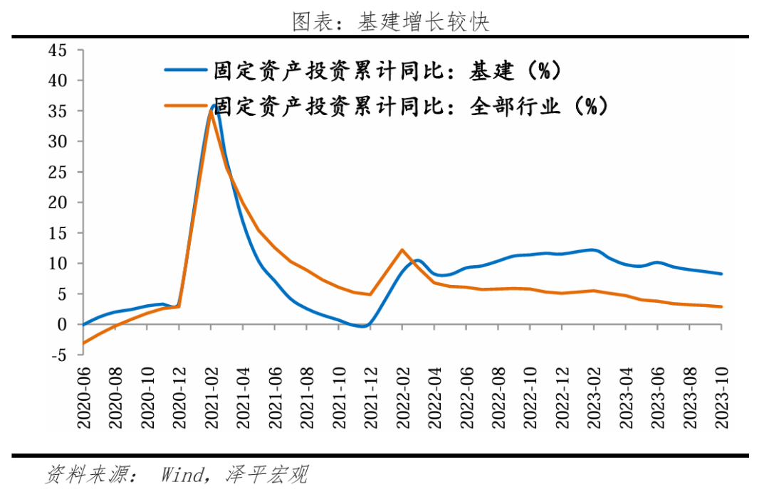 四是受市场主体活跃度不足、土地财政拖累,地方政府税收和卖地收入放缓,虽然靠专项债维持基建增长,但资金周转较慢。此轮M2高增中,政府主导的基建产业增长较快,前三季度,基建类投资在去年的高基数下保持高增长,财政持续发力,前十个月累计同比增速均值达到9.57%。