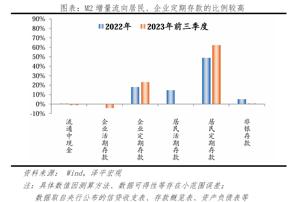 一是居民疤痕效应尚未消退,收入预期不稳定,资产负债表冲击,出现预防性储蓄。根据M2流向分解,居民定期存款占比大幅高增,并且没有跨期转化为企业存款高增,指向居民出现预防式储蓄。预防式储蓄会减少居民部门的消费行为,降低居民与企业间的货币交换活跃程度。