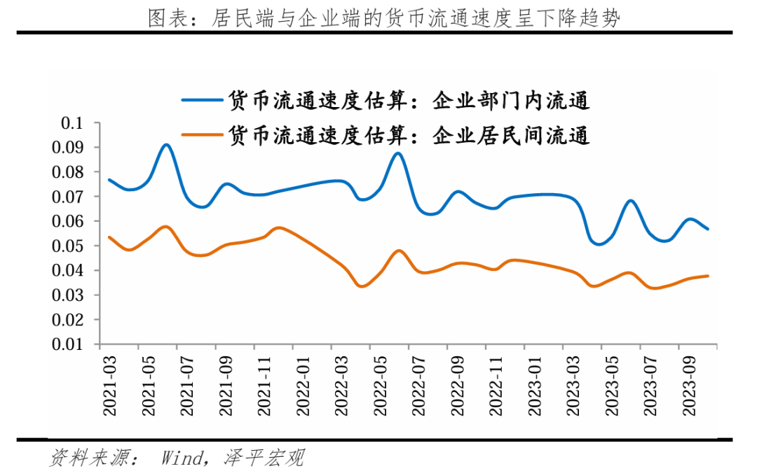 整体的货币流通速度V出现明显下降,货币沉淀到储蓄,未能转化为消费和投资。我们用GDP与M2 之比测算全部门货币流通速度V,发现V从2018年的0.50回落约10个百分点至0.45。自2022年以来货币逐渐沉淀于居民与企业的定期存款账户,退出流通领域,社会中的货币交换活跃程度显著下降,货币的循环通道不畅,V随之下降。