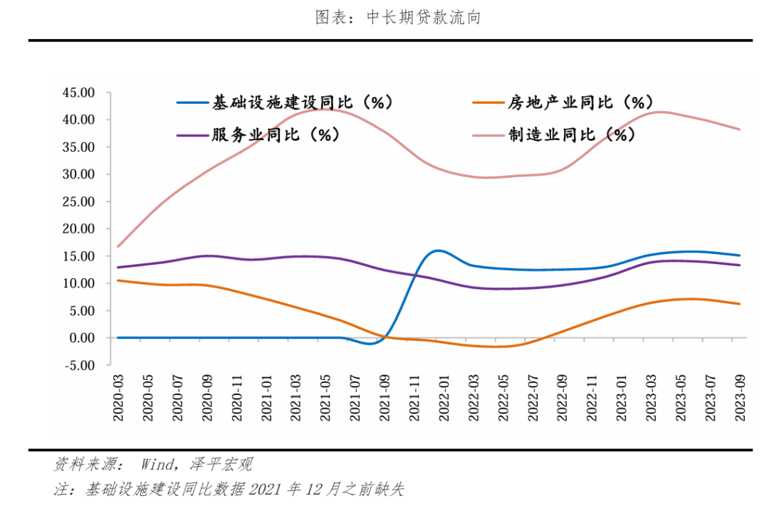 二是从货币去向看,以个人存款为主,存款呈现定期化趋势。从存量结构看,单位定期存款占M2的比例从2020年10%增加到2023年的28%,体现在信心和预期不足的情况下企业存款有定期化倾向。从行业看,制造业中长期贷款余额保持同比高位,房地产业同比低位。