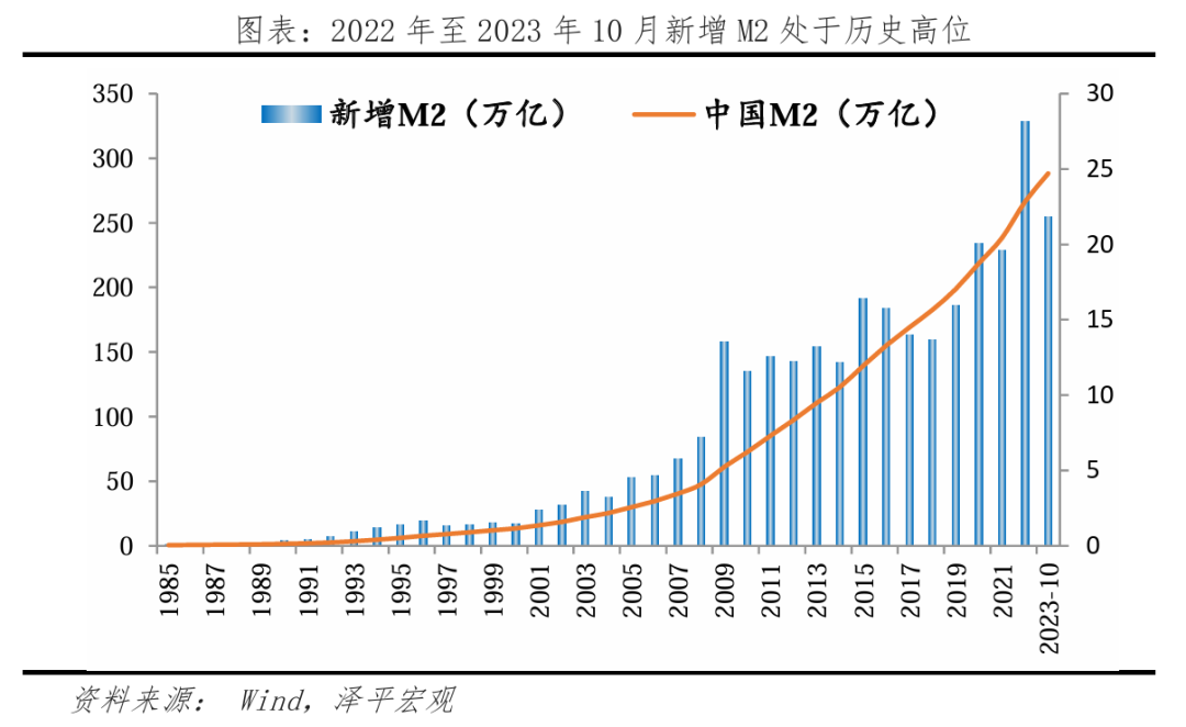 货币政策持续发力推动经济复苏,但货币投放与市场反应呈现分化。2022全年新增M2高达28万亿,年度增量创历史新高;2023年截至10月,M2继续新增21万亿,维持历史高位。2023年两度降准降息释放流动性,11月15日央行超万亿续作MLF,净投放规模达6000亿元,创2016年12月以来最高水平,宽货币持续发力稳增长。