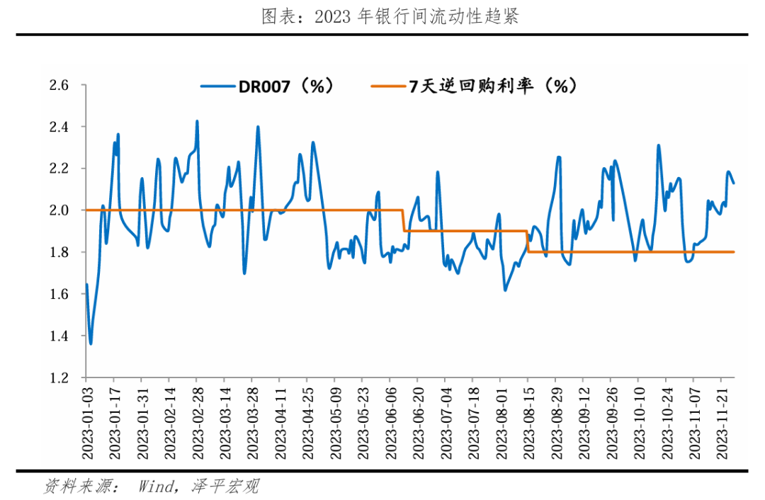 六是银行间流动性趋紧,利率中枢上移,2023年8月起DR007显著高于政策利率。
