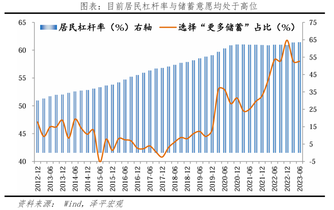 二是房地产市场预期不稳,居民购房加杠杆意愿低,居民存款难以向企业存款转化,货币交换受阻。2022年以来,货币流通速度与房屋价格关系较为密切,而房贷也是居民负债最重要的构成部分。过去十年间,居民杠杆率由2013Q4的33.5%上升至2022Q4的61.9%,同时选择“更多储蓄”的比例也由47.4%上升至61.8%。这体现出居民负债压力较大,风险偏好较低,购房加杠杆意愿较弱,居民存款难以向企业存款转化,两大部门间的货币交换受阻,拉低V。