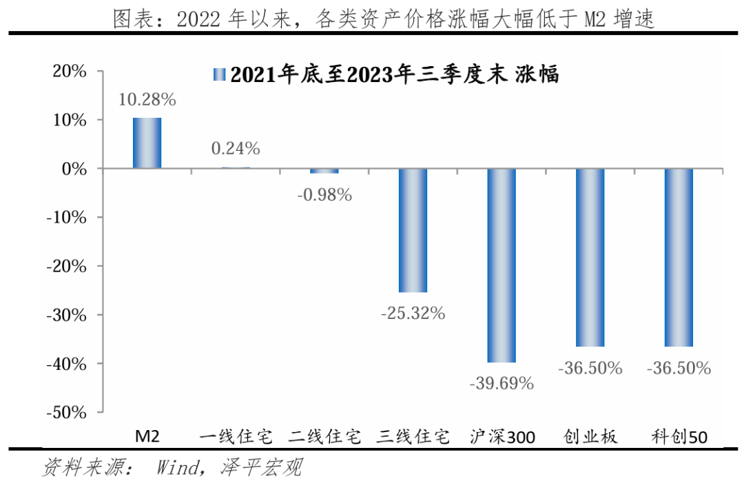 大类资产方面,此轮M2高增中,大类资产价格也未上涨。截至2023年三季度,一二三线住宅价格较2021年底的增速分别为-0.11%、0.24%、-0.98%;沪深300指数同期回落25.32%,创业板指数回落39.69%,科创50指数下降36.50%,公募基金持有A股市值也由7.03万亿下降至5.37万亿。债市方面,1年期国债收益率同期下降31.75个bp,10年期下降10.37个bp;理财方面,3个月、6个月的理财产品收益由2.81%与3.15%,大幅滑落至1.6%与1.8%。