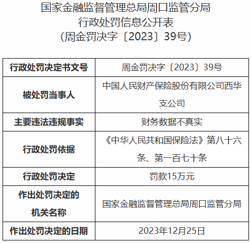 行政处罚决定书周金罚决字〔2023〕39号显示,中国人民财产保险股份有限公司西华支公司因财务数据不真实,被国家金融监督管理总局周口监管分局处罚款15万元。