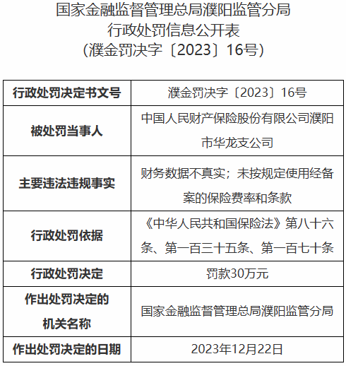 其中,行政处罚决定书濮金罚决字〔2023〕16号显示,中国人民财产保险股份有限公司濮阳市华龙支公司因财务数据不真实、未按规定使用经备案的保险费率和条款,被国家金融监督管理总局濮阳监管分局处罚款30万元。